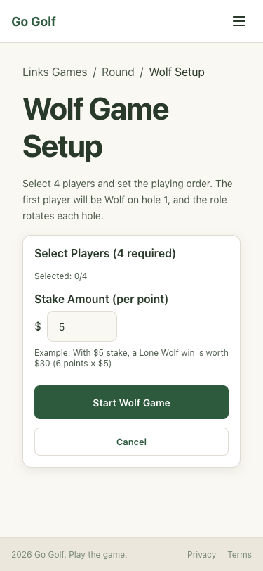 Expected Wolf game page, got: https://go-golf.pages.dev/links-games/rounds/null/wolf/setup